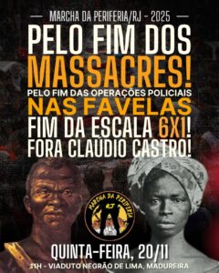 “Estaremos unidos em Marcha contra o genocídio do povo negro e periférico. Pelo fim das chacinas e das operações policiais nas favelas”, diz texto de convocação do ato.